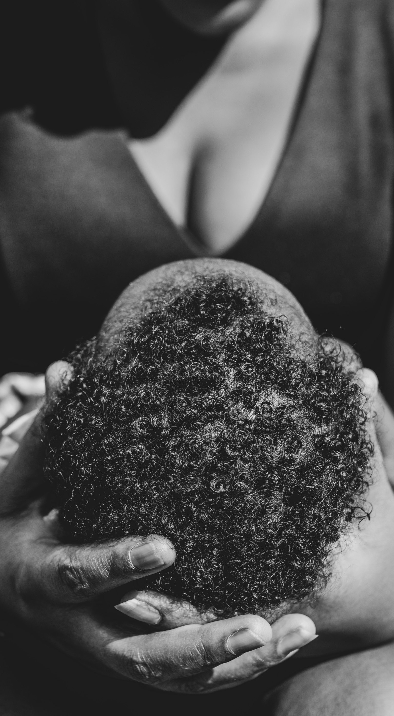 A person with curly hair cradling another person's head in their hands, black and white photograph.