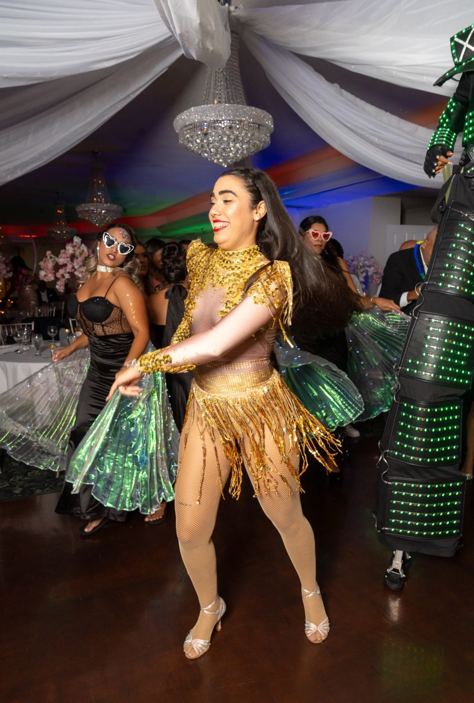 Women dancing at an indoor party with elegant drapery, chandeliers, and colorful lighting.