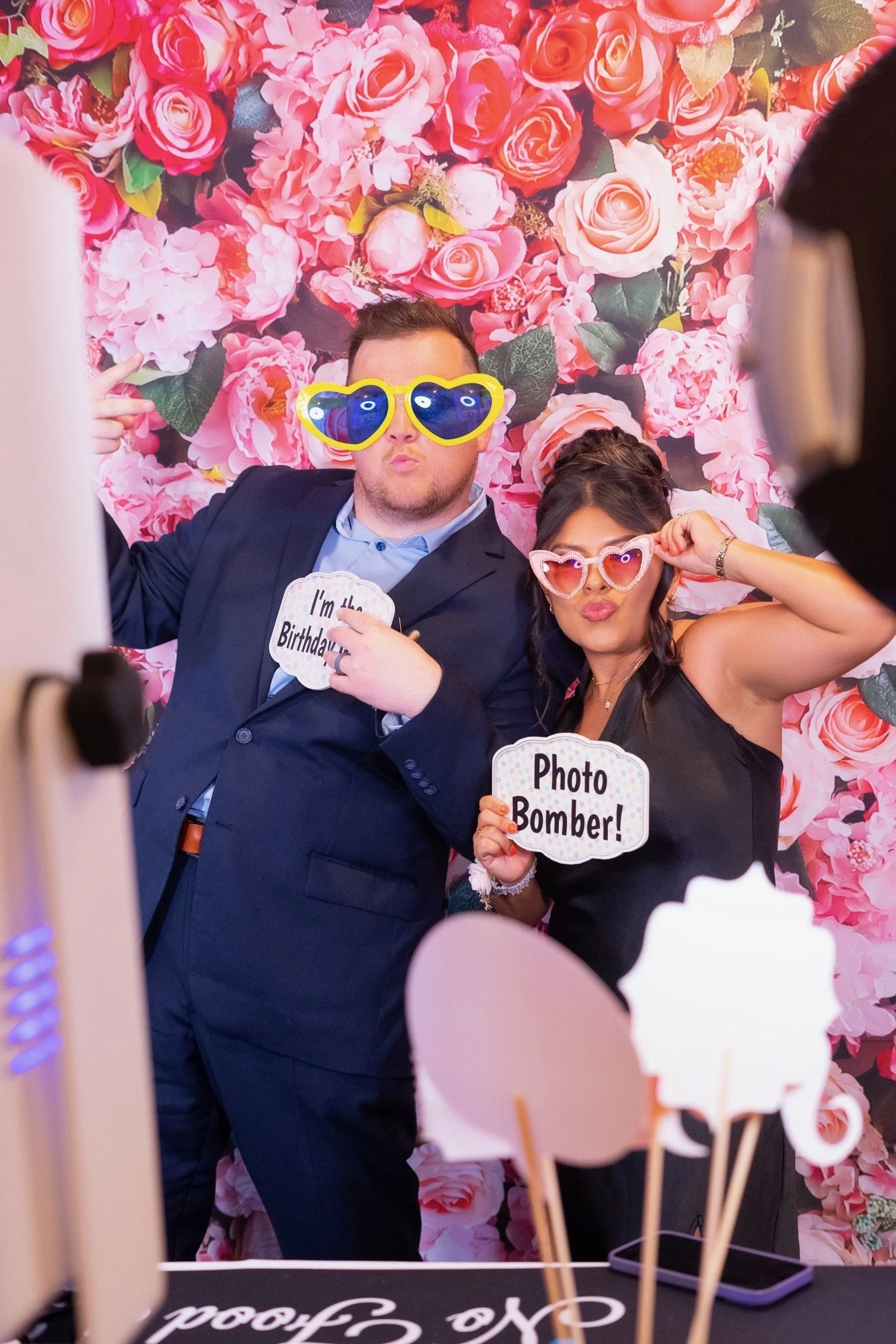 Two people at a photo booth with a pink flower backdrop, wearing funny sunglasses and holding signs that say 'I'm the Birthday!' and 'Photo Bomber!'