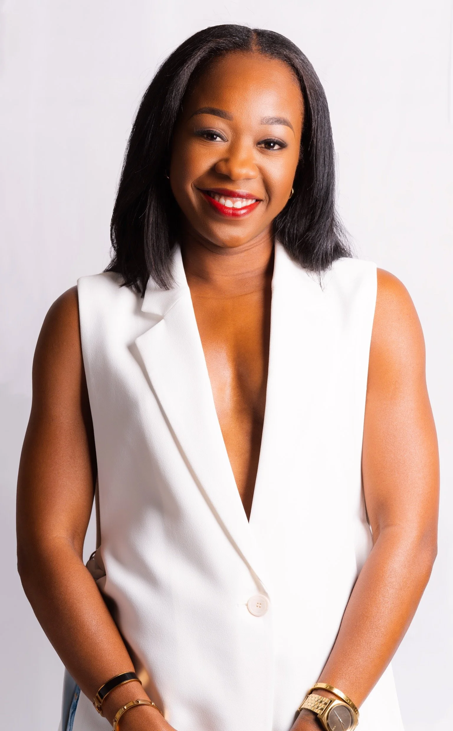 A smiling woman with shoulder-length black hair, wearing a white sleeveless blazer and gold jewelry, standing against a plain white background.