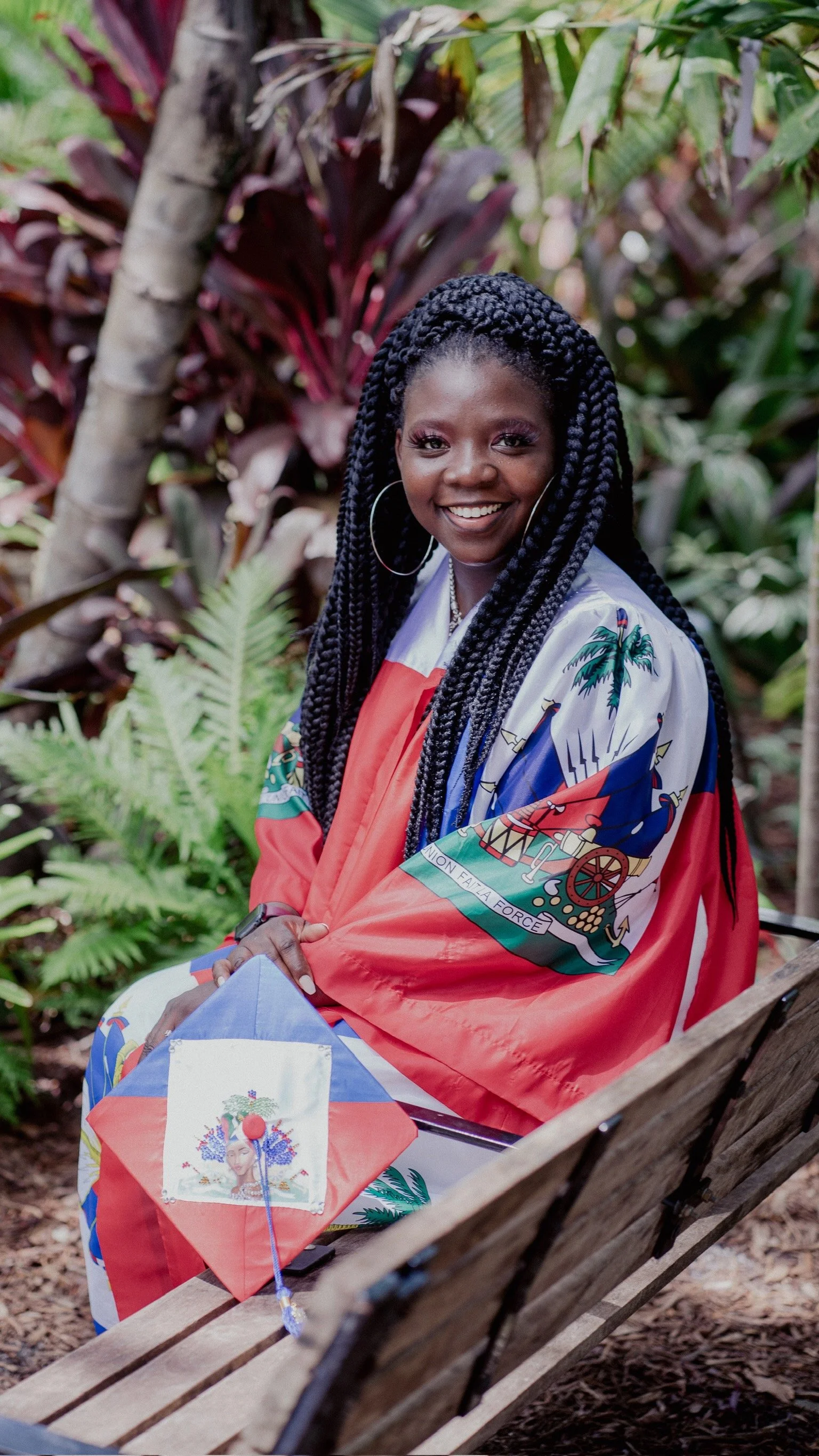 A woman wearing a colorful graduation gown sitting on a wooden bench outdoors, surrounded by green plants. She is smiling and has braided hair, with a smartwatch on her wrist and large hoop earrings. A flag or cloth with patriotic and decorative elem