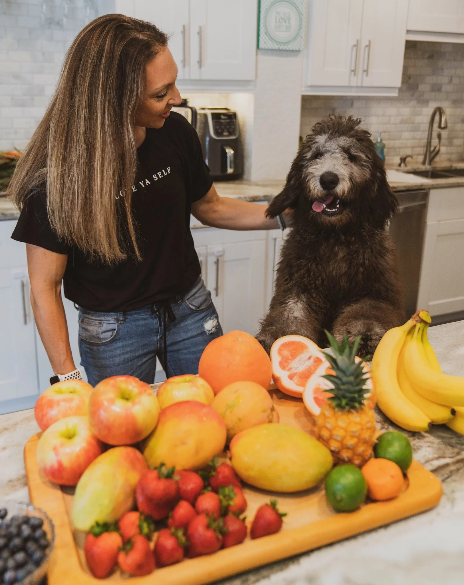 A woman and a large fluffy dog inside a kitchen, surrounded by a variety of fresh fruits including strawberries, apples, citrus, pineapple, bananas, and blueberries on a wooden cutting board.