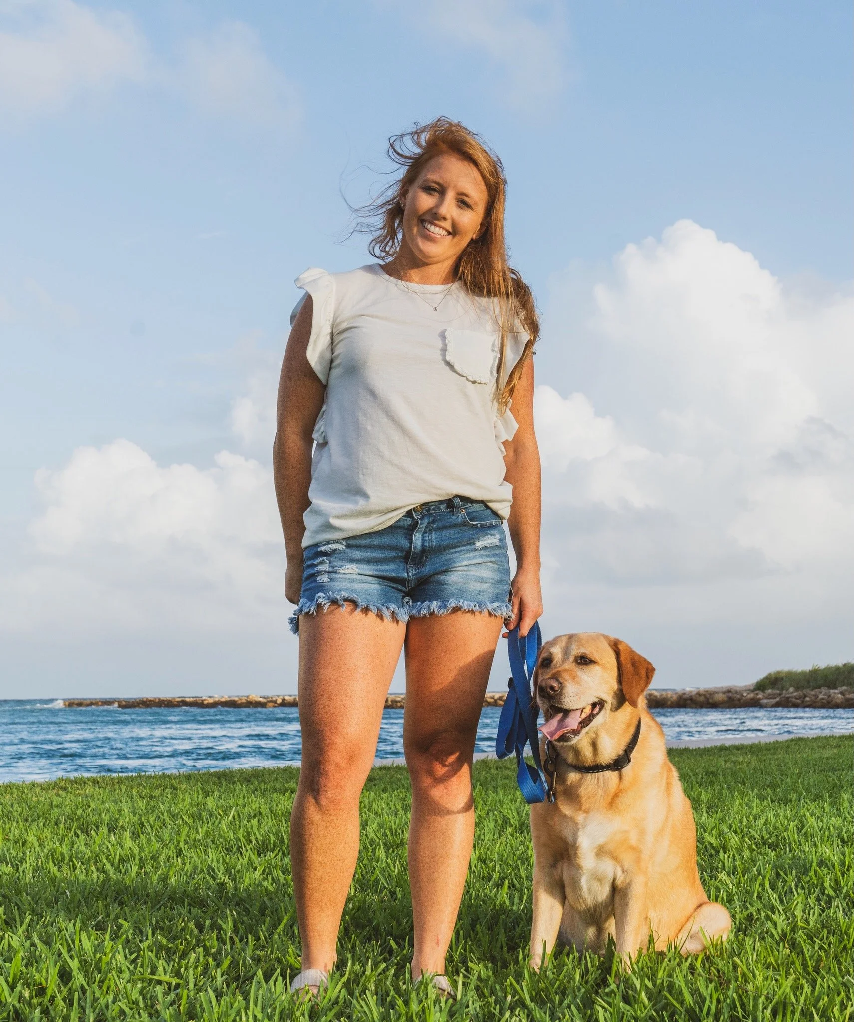 A woman with long red hair smiling at the camera, standing outdoors on green grass, holding a blue leash attached to a sitting Labrador Retriever near a body of water with a rocky island and cloudy sky background.